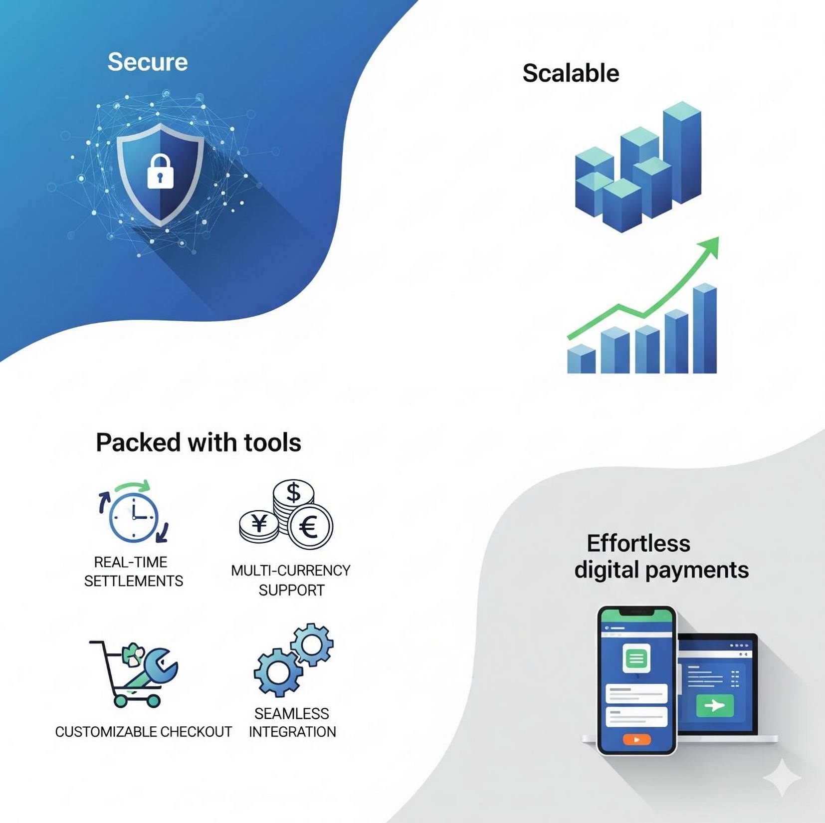 Secure, scalable and packed with tools like real-time settlements, multi-currency support, customizable checkout and seamless integration for effortless digital payments